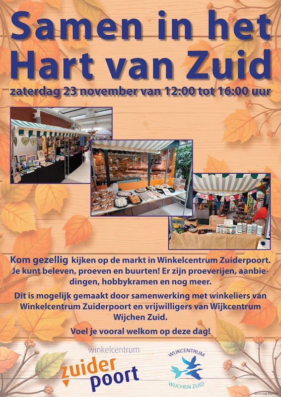 Op zaterdag 23 november 2024 (12.00-16.00 uur) organiseren Wijkcentrum Wijchen Zuid en Winkelcentrum Zuiderpoort een marktdag in het winkelcentrum.