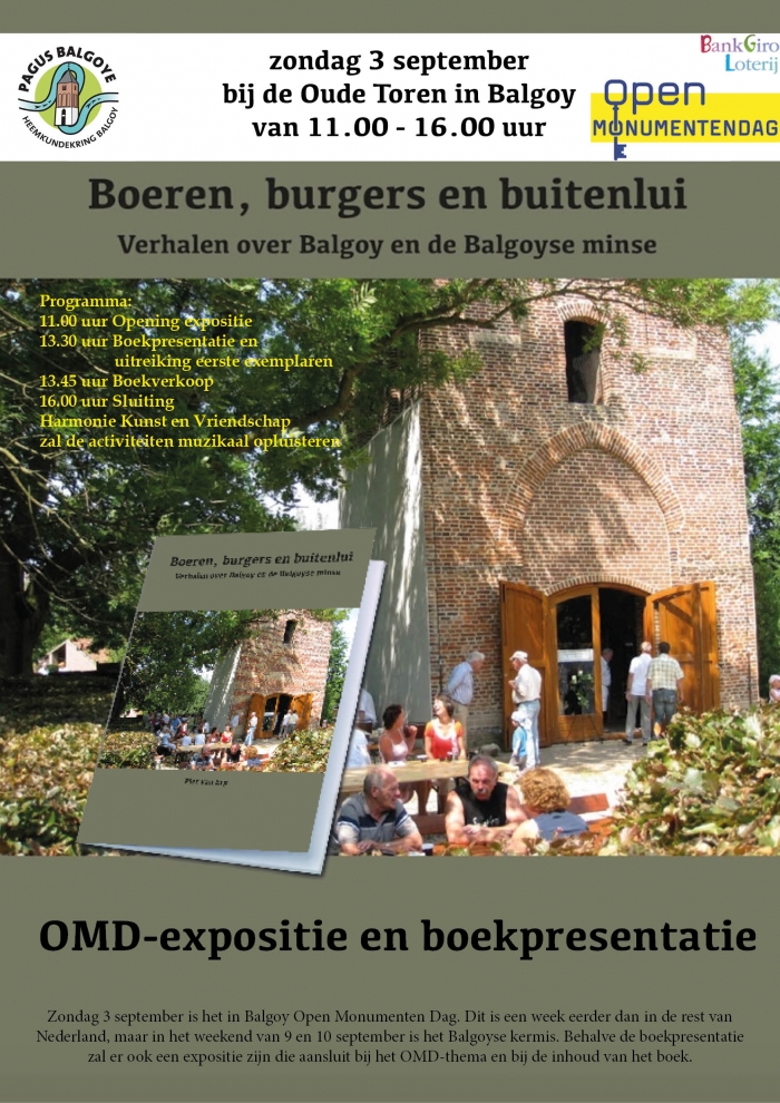 Open Monumentendag vindt in Balgoy een weekend eerder plaats i.v.m. de jaarlijkse kermis. Bij de oude toren van Balgoy wordt een expositie ingericht in het landelijke thema en zal het boek 'Boeren, Burgers, Buitenlui', geschreven door Piet van Erp, gelanceerd worden. Harmonie Kunst & Vriendschap luistert de dag muzikaal op.
