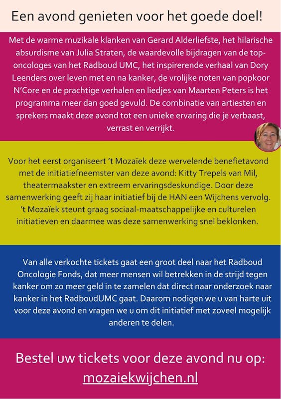 Van alle verkochte tickets gaat een groot deel naar het Radboud Oncologie Fonds, dat meer mensen wil betrekken in de strijd tegen kanker om zo meer geld in te zamelen dat direct naar onderzoek naar kanker in het RadboudUMC gaat. Daarom nodigen we u van harte uit voor deze avond en vragen we u om dit initiatief