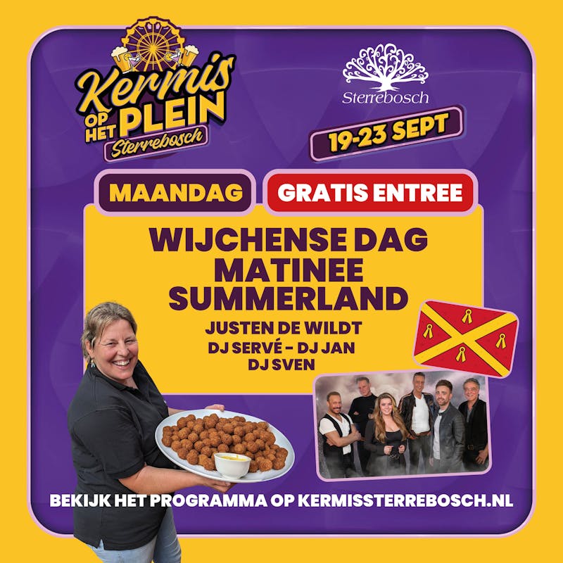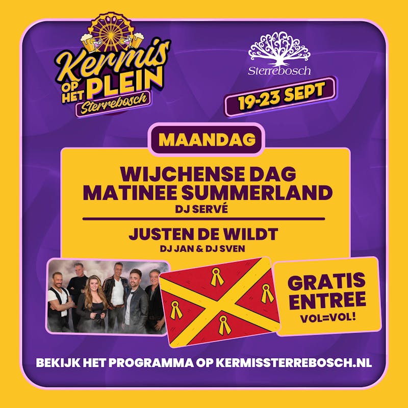 Op maandag staat wederom Summerland, de leukste party band van de regio, op het matinee tijdens De Wijchense Dag, samen met DJ Servé. Entree is gratis en iedereen is welkom. Let op, kom op tijd, want vol=vol. Maandagavond feesten we lekker door met DJ Jan en DJ Sven, samen met Justen de Wildt. Zondag en maandag middag start de gezelligste attractie al om 14:00 uur en stopt het feest pas rond middernacht zonder pauze.