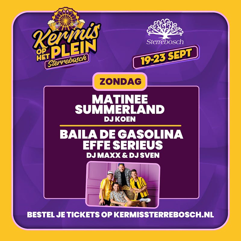 Op zondagmiddag is het matinee met live band Summerland en DJ Koen. ’s Avonds treedt Effe Serieus op, dat met hun feesthit Baila Baila ook tijdens de Pleinfeesten het Sterreboschplein op zijn kop zette. DJ Maxx en DJ Sven maken er één groot feest van.