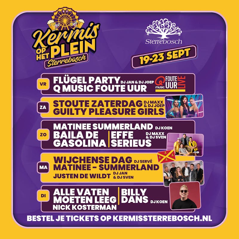 Op vrijdag start de kermis feestelijk met de grote Flügelparty met Q-Music Het Foute Uur, DJ Jan en DJ Joep. Op “Stoute zaterdag” komen de Guilty Pleasure Girls allerlei bekende hits zingen en maken DJ Maxx en DJ Joep het helemaal af.