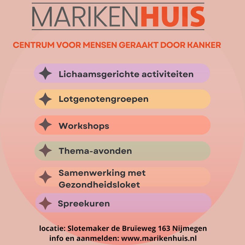 Ben jij geraakt door kanker en wil je een luisterend oor of zoek je ontspanning? De komende weken kun je bij het Marikenhuis meedoen aan allerlei activiteiten. Kijk op de website voor meer informatie en aanmelding. We vragen voor iedere activiteit een bijdrage van € 2,50 per activiteit.