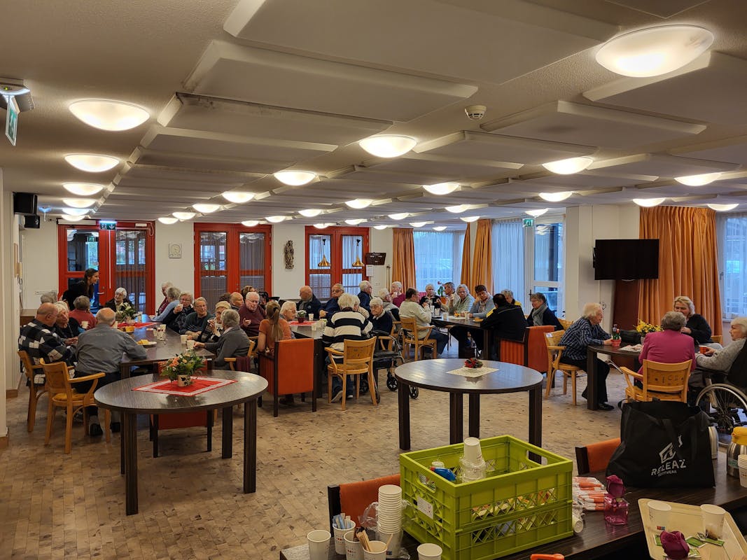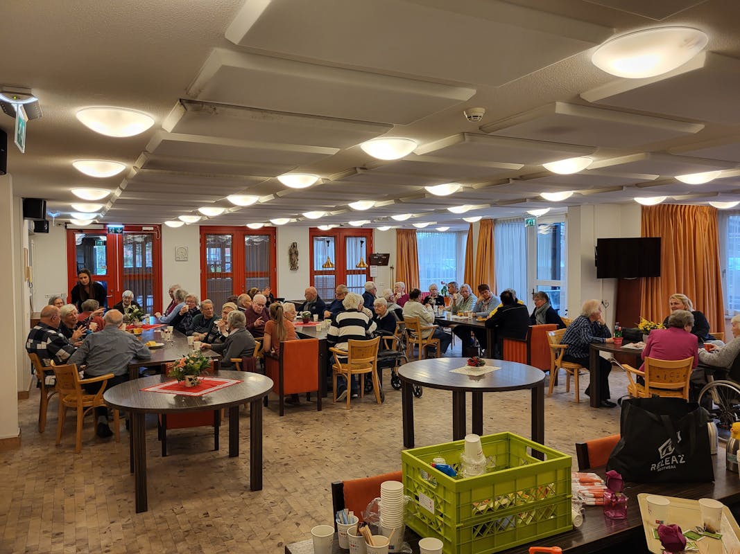 Er waren 40 bewoners die kwamen om te “buurten” onder het genot van een kopje koffie of thee met een plak lekkere cake erbij. Het was gezellig. De bewoners van Portiuncula waren blij dat ze elkaar weer eens zagen in de ontmoetingsruimte, die ze graag willen behouden om meer van dit soort activiteiten met elkaar te beleven.
