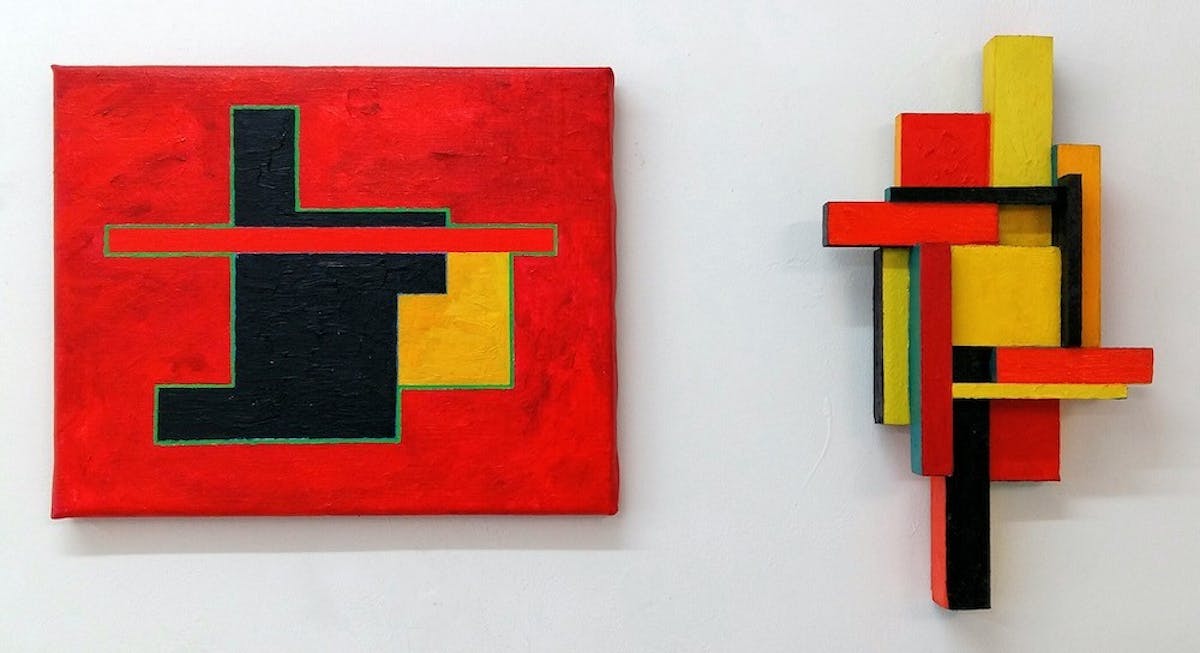 Cor Knops (schilder-tekenaar-beeldhouwer-fotograaf ) toont schilderijen en sculpturen met abstract-geometrische voorstellingen. Hij is gefascineerd door de gebouwde omgeving, industrieterreinen en bouwputten, en de vormen die je daar kunt waarnemen. Die zijn uitgangspunt voor zijn werk.