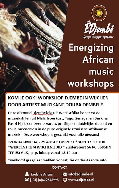 KOM JE OOK! WORKSHOP DJEMBE IN WIJCHEN DOOR ARTIEST MUZIKANT DOUBA DEMBELE.