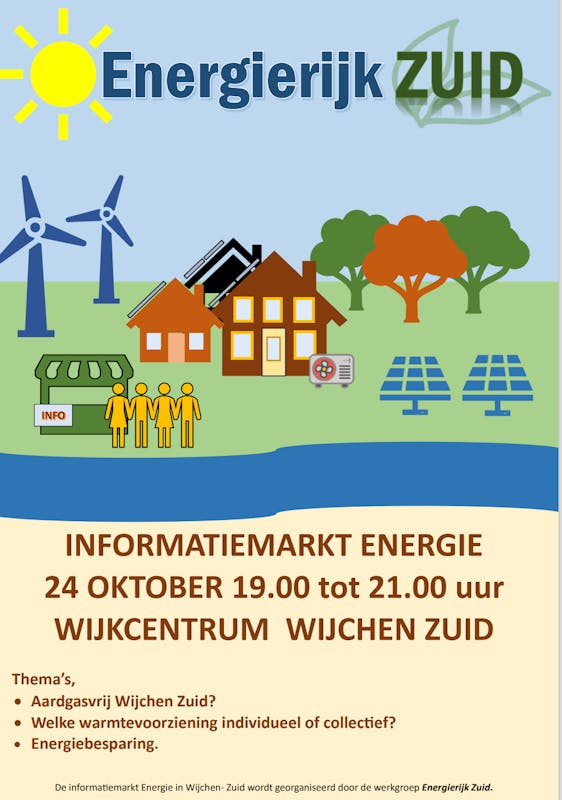 Op dinsdagavond 24 oktober houdt de werkgroep Energie Wijchen Zuid een informatiemarkt over warmte en energie in Wijkcentrum Wijchen Zuid. Op markt zullen diverse themakramen staan op het gebied van de energietransitie en de ontwikkelingen in Wijchen Zuid.