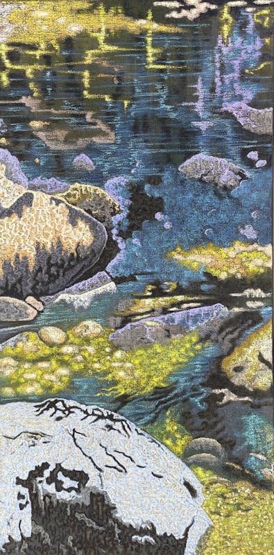 De beweging van de stroming en de lichtval op de oevers tekent zij als een vloeiend lijnenspel over een schilderachtige ondergrond die in meerdere lagen krijt (soms verdund met water) is opgebracht.