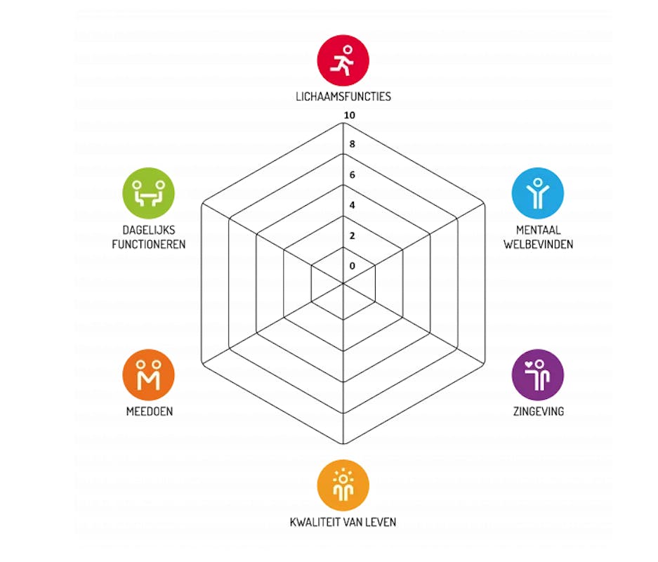 Voor mijn praktijk als leefstijlcoach is het een geweldig instrument. Op elk van de dimensies ontwikkelde het instituut van Machteld Huber zeven stellingen, die mensen een cijfer op een schaal van 0 tot 10 kunnen geven. Vervolgens komt er een oppervlakte uit op het spinnenweb en is meteen inzichtelijk welke dimensies aandacht behoeven. Het instrument geeft me vaak aanleiding om wat dieper in te gaan op een knelpunt en te bespreken in hoeverre we samen een beperkende factor kunnen oplossen of dat hulp van buiten nodig is. Denk aan eenzaamheid of financiële problemen. Halverwege en aan het einde van het leefstijltraject passeert het spinnenweb opnieuw. Enerzijds om te ontdekken wat de invloed is geweest van de leefstijlinterventie, anderzijds om te evalueren of er nog verdere ontwikkeling op een van de dimensies nodig is.