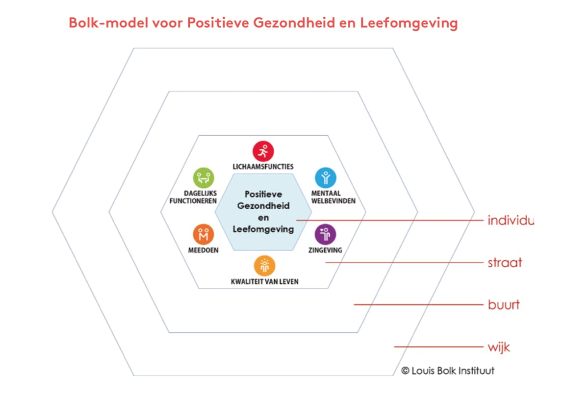 Machteld Huber heeft het concept ontwikkeld in de tijd dat ze bij het Louis Bolk Instituut werkte. Dit instituut, dat onderzoek doet naar duurzame landbouw, voeding en gezondheid, bedacht een stappenplan voor samenwerken in de wijk met Positieve Gezondheid als uitgangspunt. “Het doel is het bevorderen van gezondheid, veerkracht en eigen regie van bewoners door in te zetten op het verbeteren van de leefomgeving en de energie van bewoners,” vertelt een brochure. Centraal in deze aanpak staan de behoeften van de mensen in de wijk. Om die behoeften in kaart te brengen kan de vragenlijst van Positieve Gezondheid door middel van interviews ingezet worden, maar ook om de leefomgeving te scannen. Wellicht kan het Bolk-model voor Positieve Gezondheid een nuttig hulpmiddel zijn voor ons project Extra CooL.