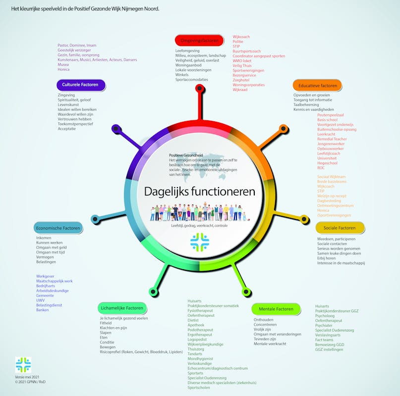 Het instrument is echter breder inzetbaar en kan zelfs als tool ingezet worden om als professionals samen te werken. Binnenkort starten we met een aantal partijen uit Leefstijlcentrum Wijchen Gezond een leefstijlinterventie speciaal voor mensen met een smalle beurs onder de noemer Extra CooL. Onherroepelijk moeten we samenwerken met het sociale domein, met het reguliere sport- en beweegaanbod, met de huisartsen en met verschillende geledingen van de gemeente. In Nijmegen Noord werkt huisarts Rob van Damme die Positieve Gezondheid verder heeft ontwikkeld en het speelveld van de wijk in kaart gebracht heeft. Hij zet het dagelijks functioneren van het individu centraal. “Ik wil als huisarts breder kijken naar de individuele mens met een klacht en in samenwerking met een professioneel netwerk zoeken naar de best passende oplossing voor die klacht,” verduidelijkt Rob van Damme de aanleiding. “De vragenlijst van Positieve Gezondheid is vooral voor de dialoog heel goed.” Van Damme is ook projectleider van het Gezondheidsplein, een nog te bouwen gezondheidscentrum in een nieuw deel van de wijk. Naast partijen uit het medisch domein zullen ook partijen uit het sociale en publieke domein zitting nemen in het Gezondheidsplein. “Dat zijn allemaal partijen die een rol kunnen spelen in het oplossen van iemands probleem. We zochten naar een mogelijkheid om Positieve Gezondheid te gebruiken voor samenwerking over de domeingrenzen van de betrokken partijen heen.”