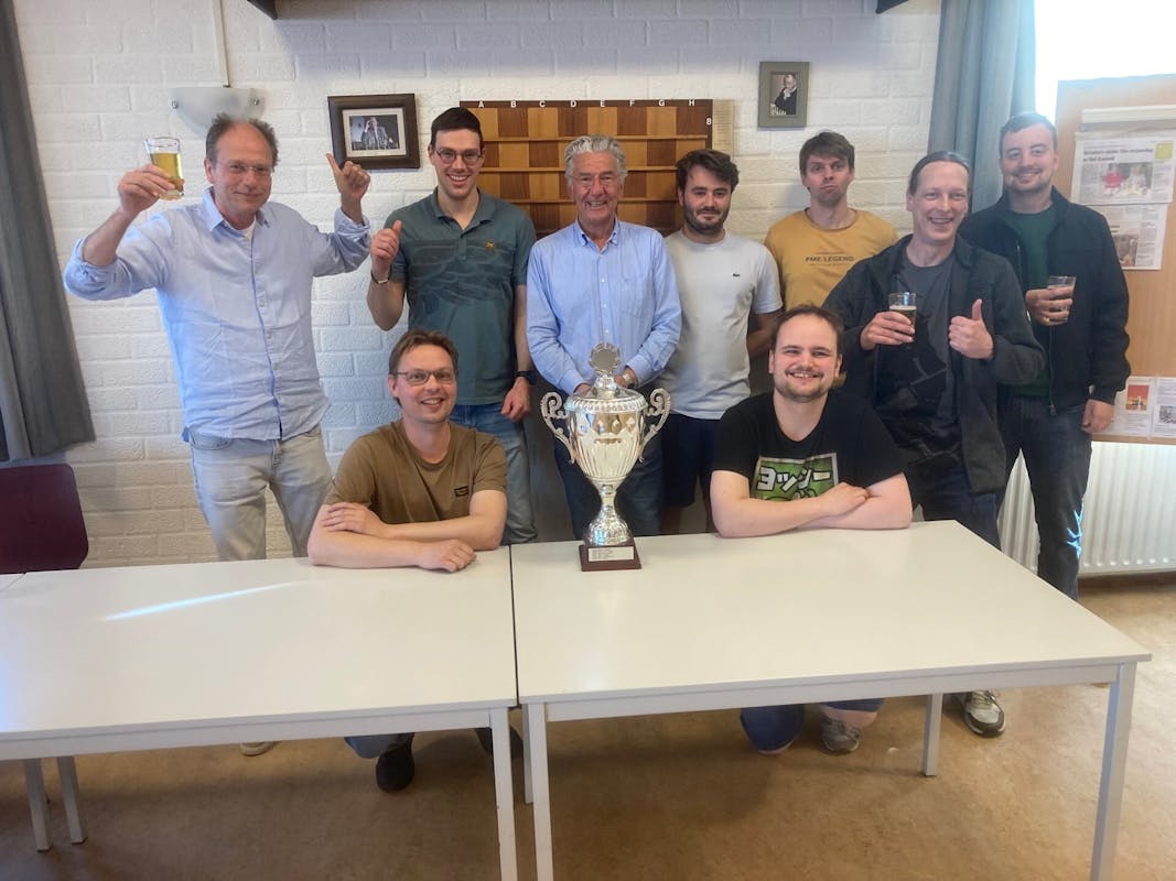 Nog tenminste anderhalve punt was er nodig om de buit binnen te hebben. Met remises van Maarten Rossen en Stan Heijmans kwamen we aardig in de goede richting. Kaz Haans haalde vervolgens het winnende punt binnen, waarna de kampioensfoto gemaakt kon worden!!!!!!