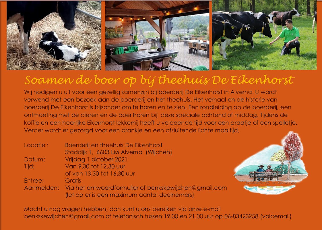 Soamen de boer op bij boerderij en theehuis de Eikenhorst in Alverna. Soamen op ’n benkske organiseert samen met MeerVoormekaar op vrijdag 1 oktober een gezellige bijeenkomst voor inwoners uit de gemeente Wijchen die veel alleen zijn. De deelnemers worden verwend met een bezoek aan de boerderij en het theehuis. Het verhaal en de historie van boerderij De Eikenhorst is bijzonder om te horen en te zien. Een rondleiding op de boerderij, een ontmoeting met de dieren en de boer horen bij deze speciale ochtend of middag. En natuurlijk is er koffie en een heerlijke zelfgemaakte lekkernij van de Eikenhorst Er is voldoende tijd voor een praatje of een spelletje. We sluiten dit bezoek af met een drankje en een afsluitende lichte maaltijd.