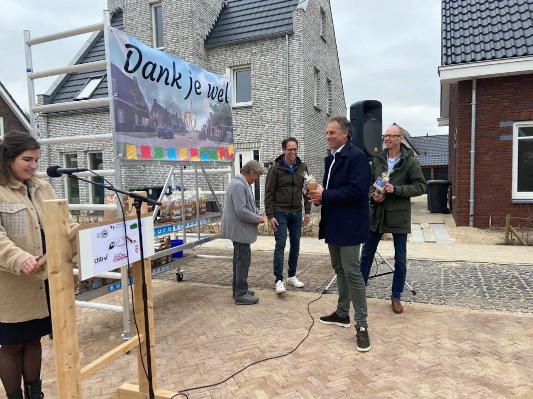Niet alleen de woningen zijn opgeleverd, ook de nieuwe buurt zelf is zo goed als gereed. Voorzitter van de Rivierduin, Bas Bruisten, en wethouder Geert Gerrits van gemeente Wijchen stonden stil bij dit bijzondere moment door de onthulling van het straatnaambord Rivierduin.