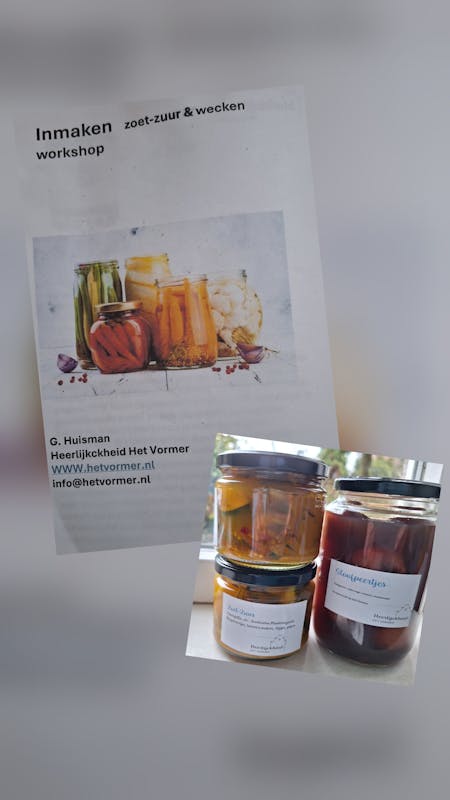 De officiële workshop duurt van tien tot twee, maar we vertrekken pas een uur later. Met potten vol stoofpeertjes en ons eigen zoet-zuur onder de arm, en een potje kweeperenjam dat Anja erbij koopt. Gerrit geeft naast deze workshop ook cursussen over fermenteren, permacultuur en biologisch moestuinieren. In de toekomst wil hij een rokerij openen en daar met plantaardige producten aan de slag gaan. En ook is hij weer van plan om zijn kennis te delen door middel van workshops.