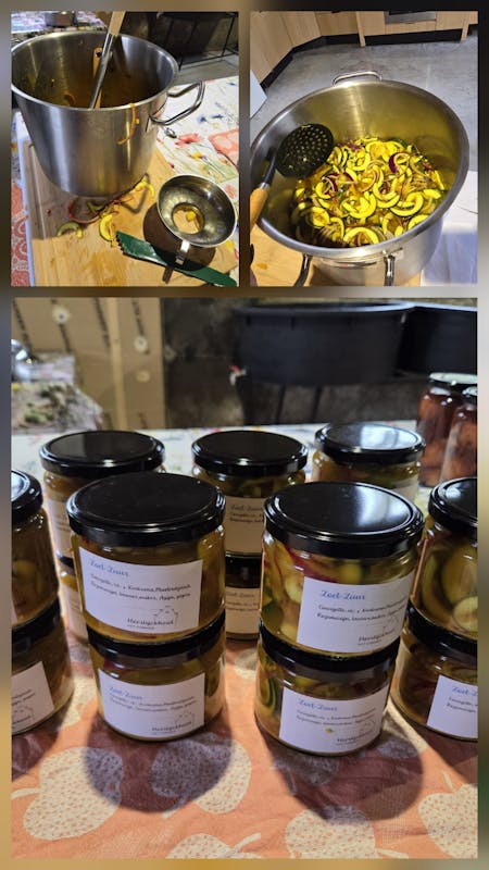 Na de introductie gaan we aan de slag. We schillen stoofpeertjes, voegen kruiden en specerijen toe en zetten de pan op het vuur. Binnen korte tijd vult de ruimte zich met de geur van kaneel, suiker en zacht pruttelende peertjes. Ondertussen maken we het zoet-zuur: courgettes en uien schoonmaken en snijden, jeneverbesjes, peperkorrels, laurier en kurkuma toevoegen, en uiteindelijk een kokend opgietsel van azijn en mosterdzaadjes. Het resultaat is een heerlijk neusprikkelend mengsel. Alles gebruiken we zoveel mogelijk biologisch, zodat de smaken zich goed kunnen ontwikkelen.