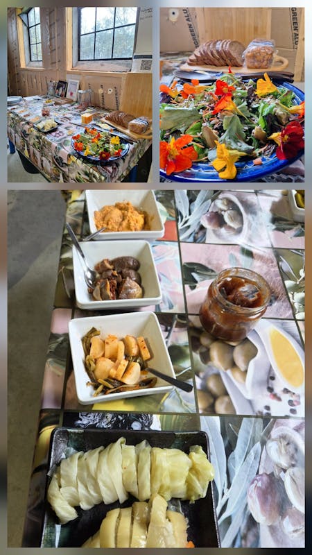 Halverwege de workshop genieten we van een lunch. Gerrit zet allerlei zelfgemaakte lekkernijen op tafel: vers brood, tapasachtige bordjes met ingemaakte gerechten en een romige tomatensoep met kokos. Het voelt als een feest voor de zintuigen. We krijgen er nieuwe energie van.