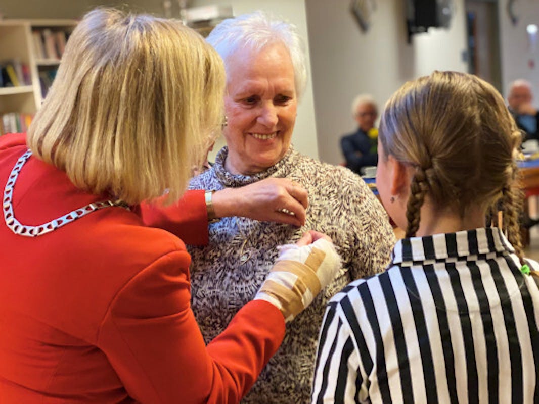 Zaterdag 19 februari is een Zilveren Draagspeld uitgereikt aan mevrouw Herma Kobussen-van den Hurk. Zij ontving dit gemeentelijke ereteken bij haar afscheidsreceptie uit handen van burgemeester Marijke van Beek. Mevrouw Kobussen-van den Hurk heeft meer dan veertig jaar met hart en ziel bijgedragen aan het runnen van wijkcentrum ’t Achterom. Zij organiseerde en ondersteunde hierbij ontelbaar veel activiteiten voor jong en oud. Nogmaals onze hartelijke felicitaties aan mevrouw Kobussen-van den Hurk!