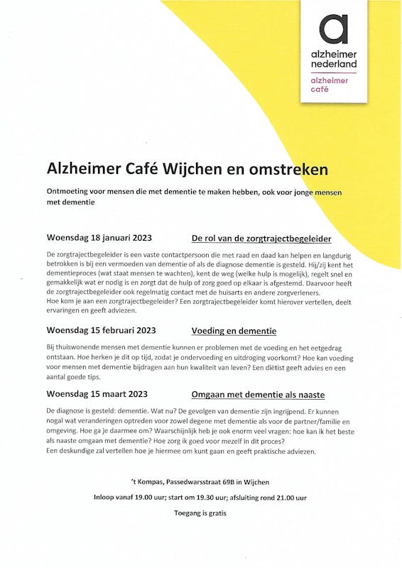- Woensdag 18 januari is er een Alzheimer café met thema De rol van zorgtrajectbegeleider.