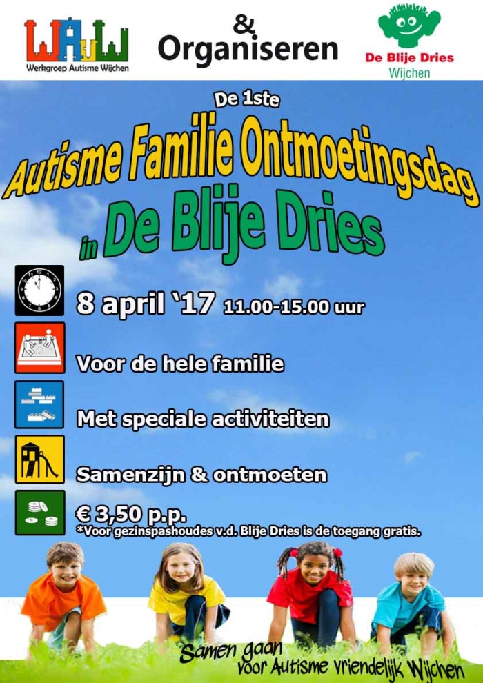 WAuW en De Blije Dries organiseren een dag speciaal voor gezinnen in de gemeente Wijchen waarbinnen ASS voorkomt. Alle kinderen, papa's en/ of mama's, broertjes en zusjes die samen willen genieten van een leuke middag in De Blije Dries zijn welkom. Er zijn speciale activiteiten, zoals een speurtocht, schminken en een ontmoetingsplek voor de ouders en brusjes. De Blije Dries is op zaterdag 8 april aanstaande vanaf 11.00 uur tot en met 15.00 uur zo autismevriendelijk mogelijk ingericht. Entree €3,50 p.p. Kom jij ook?
