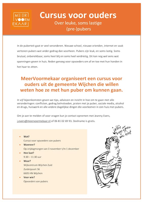 MeerVoormekaar organiseert een cursus voor ouders uit de gemeente Wijchen die willen weten hoe ze met hun puber om kunnen gaan.