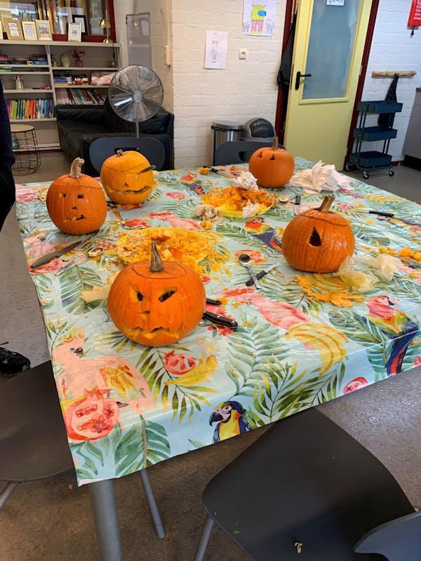 De kinderen van de Tiener BSO De Eerste Stap (zowel locatie Zuid als Noord) gingen samen met Rick aan de sla(cht)g. Ze hebben flink gekliederd om er uiteindelijk een mooie lampion van te maken. En ook dit jaar waren de kinderen weer erg enthousiast omdat de pompoenen zo goed gelukt zijn.