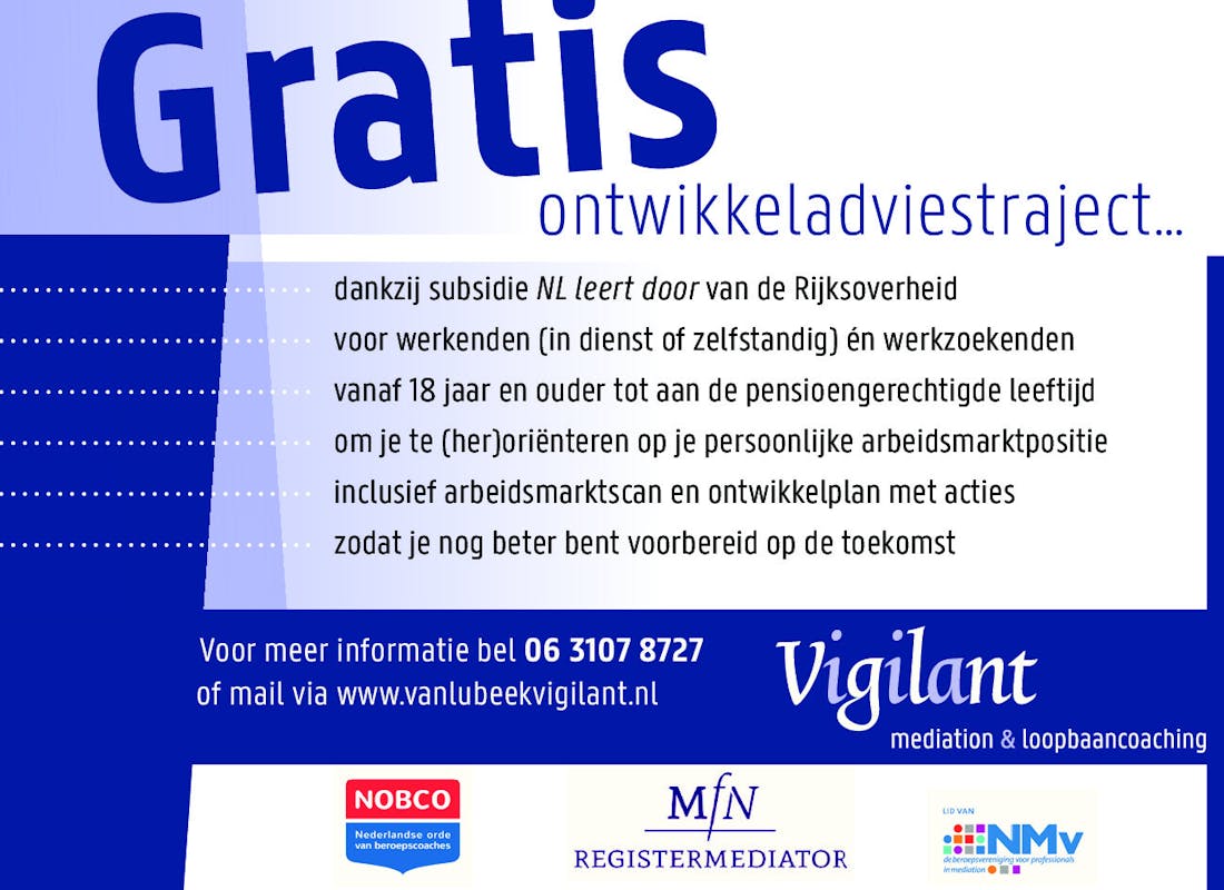 Voor werkenden (vast of zelfstandig) én werkzoekenden vanaf 18 jaar tot aan de pensioengerechtigde leeftijd is er een gratis ontwikkeladviestraject mogelijk bij een erkende loopbaanadviseur, dankzij de subsidie 'NL leert door' van de Rijksoverheid. Ook bij Vigilant mediation & loopbaancoaching kun je hiervoor terecht. Inclusief arbeidsmarktscan en ontwikkelplan. Wil jij je (her)oriënteren op je persoonlijke arbeidsmarktpositie en weten wat je zelf kunt doen om jouw positie te versterken? Kijk op de website: www.vanlubeekvigilant.nl voor meer informatie en stuur een contactformulier als je hiervan gebruik wilt maken. Zorg dat je nog beter bent voorbereid op huidige ontwikkelingen en in de toekomst. Je mag uiteraard ook bellen: 06-31078727 voor een toelichting.