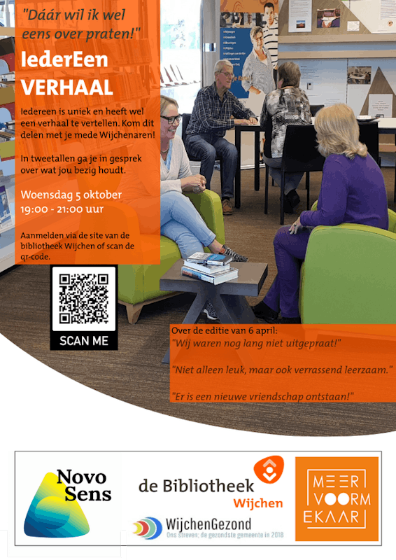 In april van het afgelopen jaar kon je meedoen aan, IederEenVerhaal. Op 5 oktober kun je weer deelnemen aan deze gezellige avond in de bibliotheek van Wijchen. Ontmoet dorpsgenoten en vertel en luister naar elkaars verhaal.