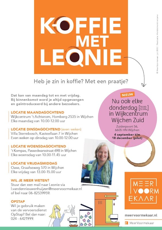Wat begon op woensdag 13 oktober 2021 in ’t Kompas, groeide uit tot een bekend en geliefd koffiemoment in Wijchen. Steeds meer mensen sloten aan op verschillende dagen en locaties. En nu is het tijd voor de volgende stap.