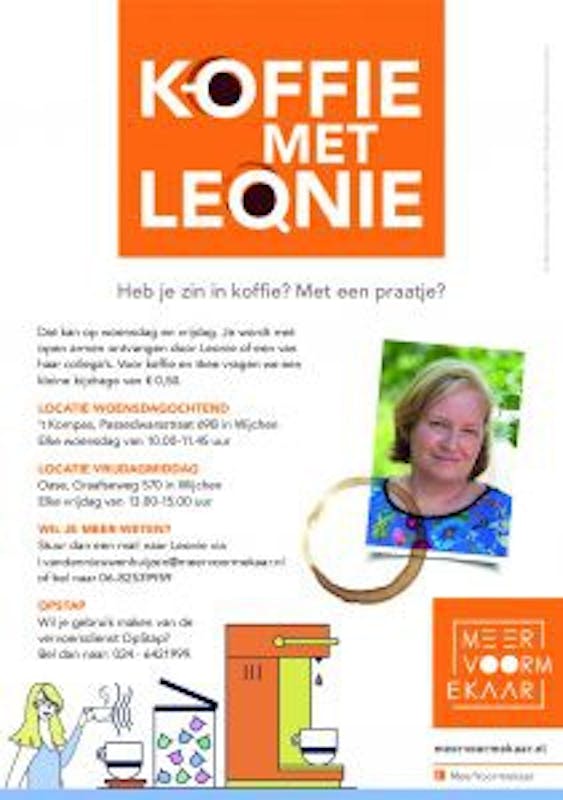 Er wordt koffie gedronken op de woensdagochtend in 't Kompas en op de vrijdagmiddag in de Oase op Alverna. Op de flyer kun je alle informatie vinden.