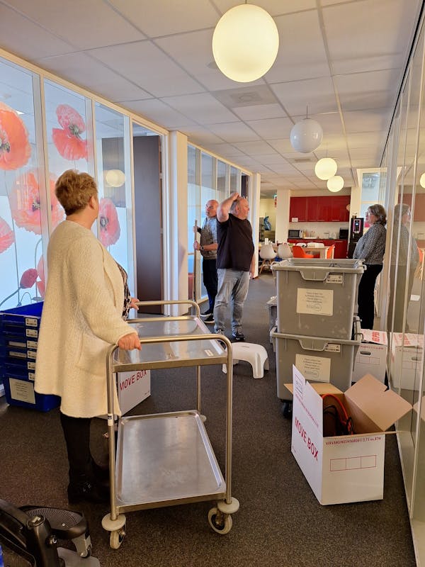 Karren vol dozen zo hoog opgestapeld dat ze bijna zelf lijken te rijden, overal klinkt geklop en gesleep, en ja… af en toe een diepe zucht. Maar tussen al het harde werk door is er vooral veel teamwork, plezier en gezelligheid! Want zeg nou zelf: verhuizen werkt verbindend.