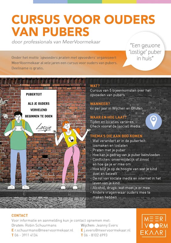 MeerVoormekaar organiseert een cursus voor ouders uit de gemeente Wijchen die willen weten hoe ze met hun puber om kunnen gaan.
