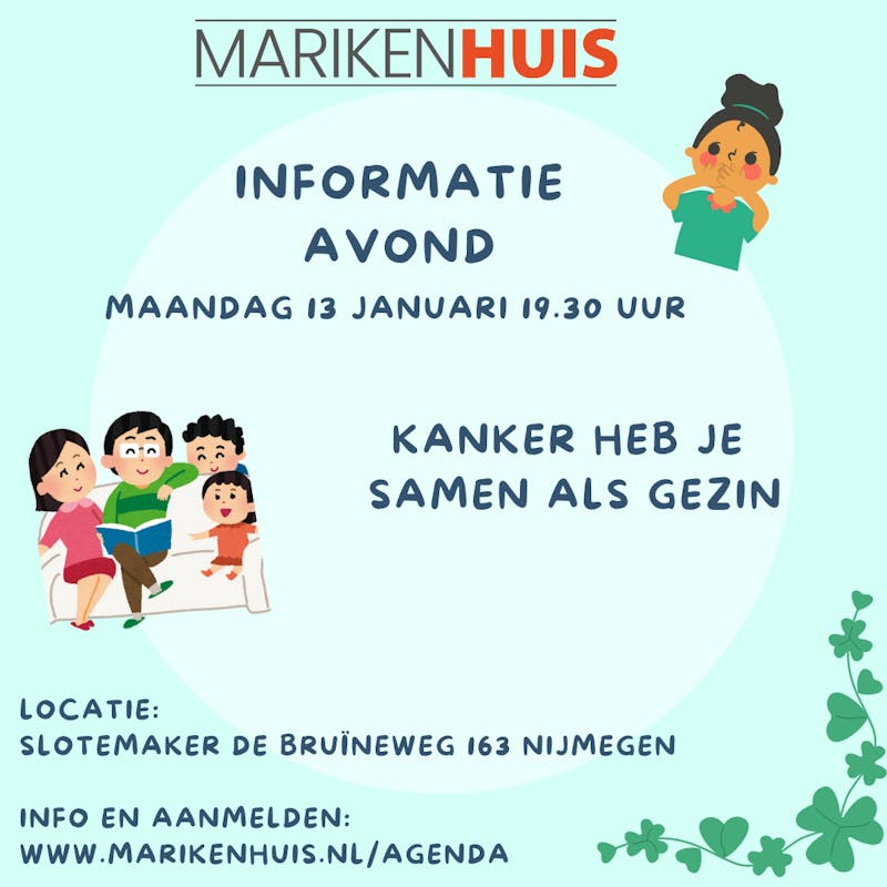 Maandag 13 januari is er van 19.30 – 21.30 uur in het Marikenhuis Nijmegen een themabijeenkomst voor ouders van kinderen die in hun gezin te maken krijgen met kanker. Dat kan gaan om een broertje of zusje, een ouder of grootouder. De ervaring leert dat de confrontatie met kanker in het gezin grote impact heeft op kinderen en jongeren.