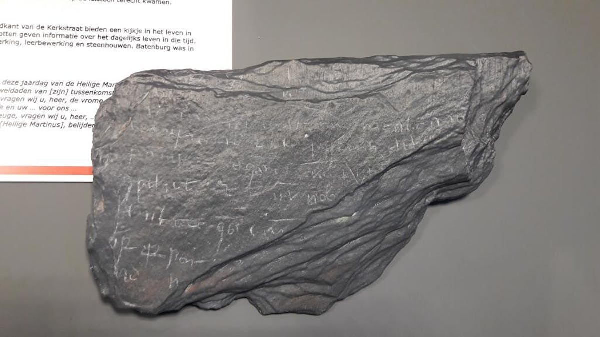 Op donderdag 24 februari jl. heeft Paul Loermans een replica van een 14e-eeuwse leisteen met daarop een gebed aan Sint Maarten overhandigd aan Jan van de Bovenkamp en Marjan Brouwer van de Plaatselijke Commissie Batenburg. De leisteen is bij archeologisch onderzoek in Batenburg in de buurt van de Oude St. Victor gevonden. Deze kerk had een oudere voorganger, die er al stond toen de leisteen met het gebed erop in de 14e eeuw in de bodem terecht kwam. Waarschijnlijk kwam de schrijver van het gebed aan Sint Maarten regelmatig in deze kerk.